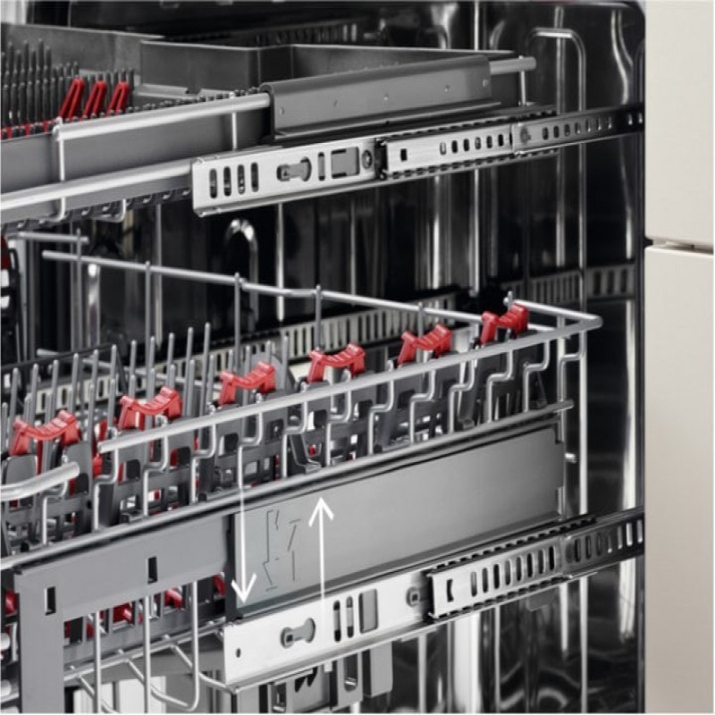 Ви оціните ефективність і зручність, які надає кошик QuickLift. Навіть якщо кошик повністю зайнятий громіздкими предметами, зручне регулювання висоти полегшить завантаження та вивантаження посуду.